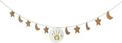 Гирляндът на "Baby Art" е идеален за декорация на детската стая. Към него има златисти елементи за нанизване под формата на луна и звезда, и кръгъл елемент на който може да поставите отпечатък на ръчичката на вашето дете. С комплекта за декорация може да направите интересен подарък или да създадете уникален спомен, като не се нуждаете от допълнителни материали, защото всичко нужно е включено в него. Елементът за отпечатък е с ∅ 10 cm. Създаване на отпечатък: Измийте и подсушете добре вашите ръце и тези на детето. Вземете боята и я нанесете върху ръката на детето. Разнесете боята добре. Направете ... |
