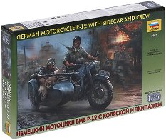 Умален модел на военен мотор с кош BMW R-12 и фигури на немски войници. Дължина на модела 6.5 cm. BMW R-12 се произвежда от 1935 до 1942 г., над 36 000 бройки са произведени за цивилни и военни нужди. Това е стандартен мотор с кош на немската армия, който се е използвам за доставка на храна и амуниции, разузнаване, бърза помощ и още много цели. Притежава 750 кубиков двигател с 18 конски сили и достига максимална скорост от 85 km/h. Специалните сили от Вермахта използвали BMW R-12 за бойни цели с монтирана картечница на коша. За да може да сглобите и залепите този макет, ви е необходимо лепило. Елементите на модела са ...