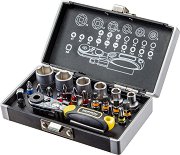 Комплектът на  Topmaster  е предназначен за завиване и развиване на болтове и винтове. Накрайниците са изработени от S2 стомана, която осигурява висока издръжливост и здравина и имат захват 1/4" шестостен (HEX). Разполага с мини тресчотка с 50 зъба и накрайници с дължина 25 mm.   Вид на накрайниците:   битове 25 mm     PH1  PH2  PH3  PZ1  PZ2  PZ3  SL3  SL5  SL6  H3  H4  H5  H6  T10  T15  T20  T25     вложки 1/4"    ∅ 5 mm  ∅ 6 mm  ∅ 8 mm  ∅ 10 mm  ∅ 12 mm  ∅ 13 mm     адаптер за битове 1/4" тресчотка 1/4"  ...  |