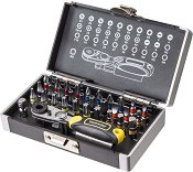 Комплектът на  Topmaster  е предназначен за завиване и развиване на болтове и винтове. Накрайниците са изработени от S2 стомана, която осигурява висока издръжливост и здравина и имат захват 1/4". Комплектът включва мини тресчотка с 50 зъба и накрайници с дължина 25 mm.   Вид на накрайниците:   битове 25 mm     PH1  PH2  PH3  PZ1  PZ2  PZ3  SL3  SL4  SL5  SL6  H3  H4  H5  H6  T10  T15  T20  T25  T27  T30  TT10  TT15  TT20  TT25  TT27  TT30     адаптер за битове 1/4" тресчотка 1/4"  ...  |