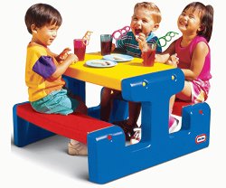 | На пикник, в детската градината или на двора, тази масичка е перфектната мебел, която ще събере всички деца да играят заедно. Тя е достатъчно голяма, за да може вашето дете да си покани поне 5 приятели да седнат заедно. Разполага с лесен за поддържане плот и две удобни, ергономични пейки, здраво закрепени за масата. Малчуганите могат да си наредят моливи и флумастри за оцветяване върху широкият плот или да си похапват бисквитки и лакомства. Децата ще се чувстват самостоятелни и свободни да си играят на масичката, отделени в свой собствен кът.  Детската маса е изработена от здрава и устойчива на атмосферните промени  ...  |