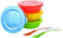 Комплектът на "Munchkin" съдържа 4 броя детски купички за хранене в различни цветове, 4 капачета и 2 лъжички. Купичките са изработени от издръжлива на продължителна употреба пластмаса, а практичните капачета позволяват лесно пренасяне на съдържанието, без опасност от разливане. Лъжичките са с дължина на дръжката, която прави загребването на храната от бурканчето по-лесно. Освен това са безопасни за използване в микровълнова фурна, хладилник и съдомиялна. Продуктът не съдържа Бисфенол А Бисфенол А е химическо съединение, което влиза в състава на различни промишлени пластмаси и смоли. Намира приложение в ... |