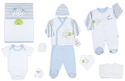 Комплектът за изписване от 10 части на "ciccimbaby" е изработен от мека и приятна на допир материя със състав 100% памук, който е нежен на допир до деликатната бебешка кожа. Той се състои от пелена, гащеризон, блузка тип "прегърни ме", камизолка, боди с къс ръкав, ританки, ръкавички, шапка, лигавник тип бандана и чорапки. Комплектът се отличава със стилен дизайн и ефектно съчетани декорации и цветове на отделните части. Комплектът е с размер 56 cm и е подходящ за бебета от 0+ до 3 месеца. ... |