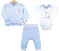Бебешкият комплект от 3 части на ciccimbaby се състои от суитшърт, боди с къс ръкав и панталон. Той е изработен от мека, плътна и приятна на допир материя със състав 100% памук, който е нежен на допир до чувствителната бебешка кожа. Суитшъртът и панталонът се отличават със стилен десен в нежен пастелен цвят и удобни ластични ленти на ръкавите, крачолите и талията. А бодито има стилна апликация на гърдите и семпъл едноцветен десен, който е чудесно допълнение към цялостната визия на комплекта. За по-лесно обличане и събличане на суитшърта са предвидени копчета по дължината на предната част, панталонът има широк ластик на ... |