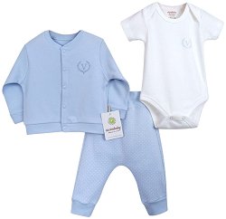 Бебешкият комплект от 3 части на ciccimbaby се състои от боди с дълъг ръкав, панталон и шапка. Той е изработен от висококачествено 100% памучно трико, което е нежно на допир до деликатната бебешка кожа. Бодито се отличава със забавен десен и разполага с тик-так копчета между крачетата и над лявото рамо за по-удобно обличане и смяна на пелените. А панталонът е със семпъл едноцветен десен и е снабден с удобен ластик за лесно обуване и събуване. Комплектът се допълва от шапка, която покрива добре главата на бебето. ... |
