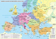 Характеристики: географска мрежа; държави, представени чрез държавни граници и фоново оцветяване; васални земи на Османската империя, представени чрез щриховка; граници на големи самостоятелни владения; граница на Свещената римска империя; хидрография; важни морски търговски пътища; столици и градове; важни търговско-занаятчийски центрове; големи панаири или пазари; центрове на корабостроене; надписи на хидрография, държави и други; легенда. Картата е двустранно ламинирана. Изработена е от винил с пластмасови лайсни в долния и горния край и шнур на горната лайсна за окачване на картата. Размерите на ... |