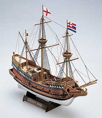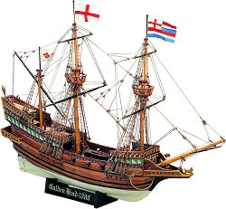 Умален модел на галеон - Златна кошута, използван за околосветско пътешествие през 1577 г. под командването на сър Френсис Дрейк. По време на плаването с този кораб сър Френсис Дрейк открива протока "Дрейк", разделящ Америка от Антарктида и югозападната част на Огнена земя. Оригинално описание: The galleon Golden Hind set out in 1577 under Sir Francis Drake's command for a historical circum navigation of the globe - Route: Atlantic Ocean - Straits of Magellan - Peruvian coasts - Moluccas - Java - Cape of Good Hope - Plymouth. При сглобяването на този макет ще ви е необходимо и лепило за дървени ... |
