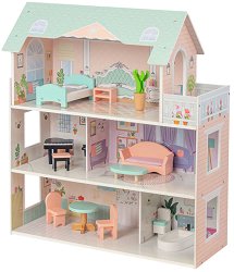 Дървената къща ще бъде прекрасен дом за куклите на вашето дете. Тя разполага с 3 етажа и има тераса. На първия етаж са разположени кухня и баня. Вторият етаж разполага с музикална стая и хол. На третия етаж се намира спалнята. Мебелите, които са включени в комплекта, са столове, кухненска маса, вана, тоалетна, диван, маса, пиано, стол за пиано, легло, нощно шкафче и растение. Къщата е декорирана в прасковен и светлозелен цвят. Децата могат да разиграват ролеви игри като научат куклите си да свирят на пиано или се погрижат за тях като ги приготвят за сън. Дайте им шанс да развият своето въображение и да се забавляват. ... |