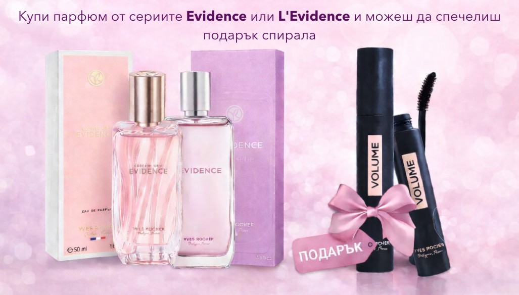 Купете парфюм Yves Rocher Evidence от публикуваните на страницата на кампанията. Ако номерът на поръчката ви завършва на цифра от 1 до 9 - ПЕЧЕЛИТЕ спирала за мигли Yves Rocher*.